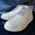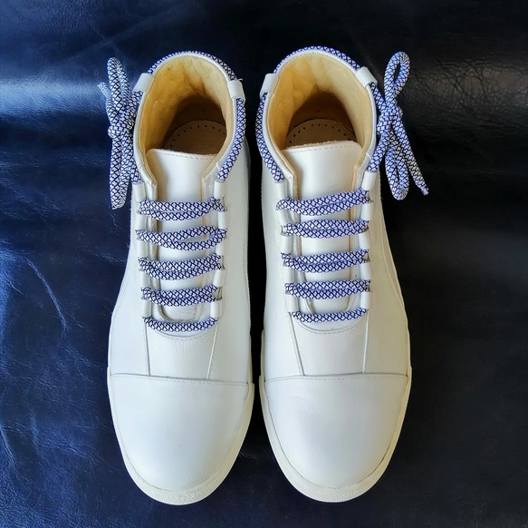 アッパーは上質なホワイトレザーを基調として外側に紐を結びで通す工夫をしました。